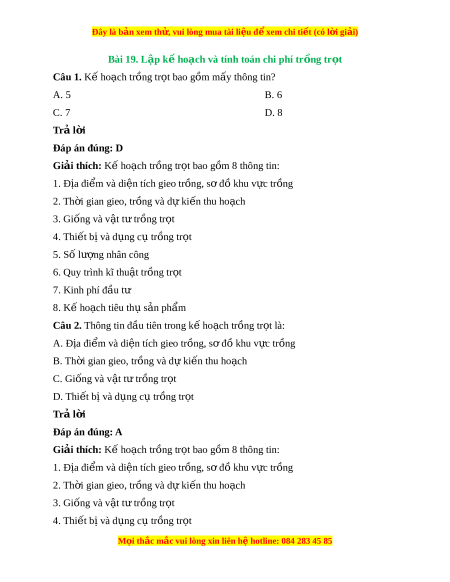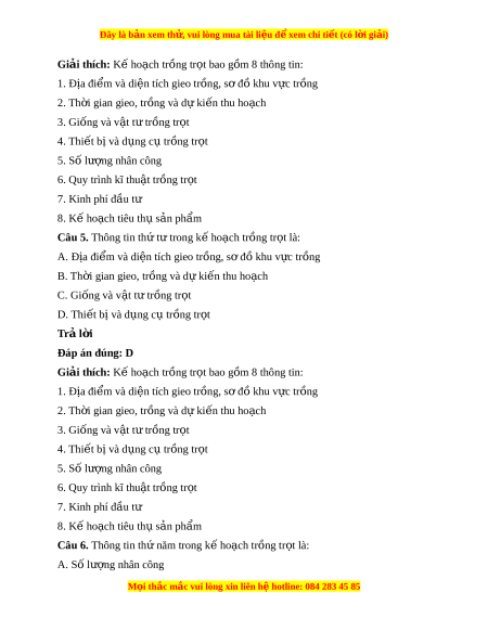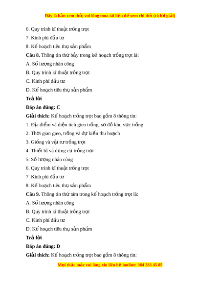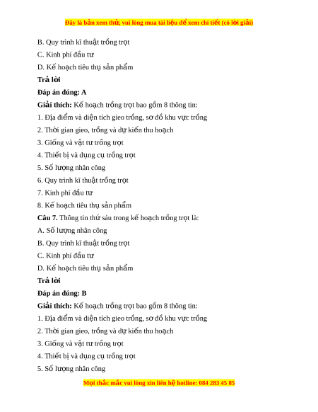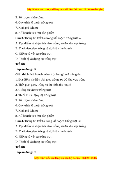 Đây là bản xem th , vu ử i lòng mua tài li u ệ đ xe ể m chi ti t (c ế ó l i ờ gi i ả ) B. Quy trình kĩ thu t ậ tr ng t ồ r t ọ C. Kinh phí đ u t ầ ư D. Kế ho ch t ạ iêu th s ụ n ph ả ẩm Trả l i ờ Đáp án đúng: A Giải thích: K ho ế ch ạ trồng tr t ọ bao gồm 8 thông tin: 1. Địa đi m