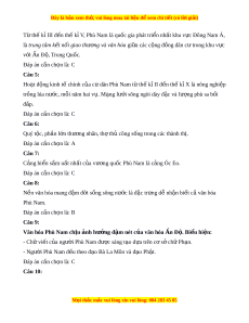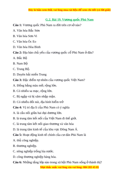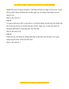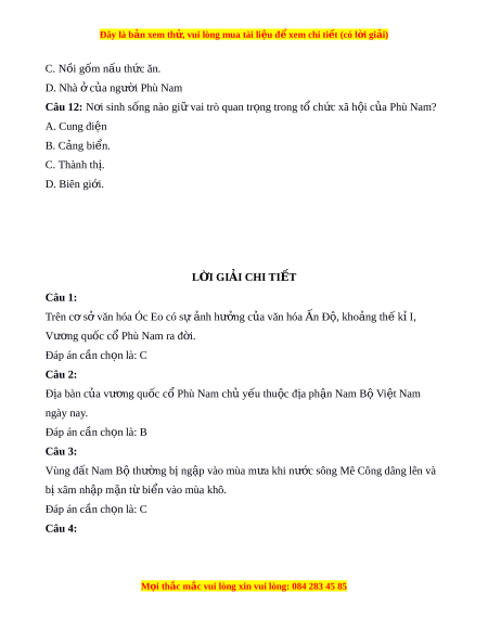 Đây là bản xem th , vu ử i lòng mua tài li u ệ đ xe ể m chi ti t (c ế ó l i ờ gi i ả ) T t ừ h k ế ỉ III đ n t ế h k ế ỉV, Phù Nam là qu c gi ố a phát tri n nh ể t ấ khu v c ự Đông Nam Á, là trung tâm k t ế n i ố giao thư ng ơ và văn hóa gi a ữ các c ng đ ộ ồng dân cư trong khu v c ự v i ớ n Ấ Đ , ộ Trung Qu c. ố Đáp án c n ch ầ n l ọ à: C Câu 5: Ho t ạ đ ng ki ộ nh t chí ế nh c a ủ c dân Phù N ư am t t ừ h k ế I ỉ I đ n t ế h k ế X ỉ là nông nghi p ệ trồng lúa nư c, m ớ ỗi năm hai v . M ụ ng ạ lư i ớ sông ngòi dày đ c và ặ lư ng phù s ợ a b i ồ đ p. ắ Đáp án c n ch ầ n l ọ à: C Câu 6: Quý t c, ộ phần l n ớ thư ng nhân, t ơ h t ợ h công ủ s ng t ố rong các thành th . ị Đáp án c n ch ầ n l ọ à: A Câu 7: C ng bi ả n s ể ầm uất nh t ấ c a v ủ ư ng ơ qu c ố Phù Nam là c ng Ó ả c Eo. Đáp án c n ch ầ n l ọ à: C Câu 8: N n ề văn hóa mang đ m ậ đ i ờ sống sông nư c ớ là đ c ặ tr ng d ư nh ễ n ậ bi t ế c văn hóa ả Phù Nam. Đáp án c n ch ầ n l ọ à: B Câu 9:
