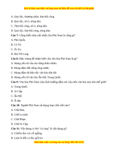 C. Thợ thủ công, nô tì, nông dân. D. Quý t c, ộ th t ợ h công, nông dân. ủ Câu 7: C ng ả bi n s ể m ầ u t ấ nh t ấ c a ủ Phù Nam là c ng ả gì? A. Phú Quốc. B. Cô Tô. C. Óc Eo. D. Bái T L ử ong Câu 8: Đ c ặ tr ng d ư nh ễ n ậ bi t ế c a văn ủ hóa Phù Nam là gì? A. Mang y u t ế ố c a núi ủ r ng t ừ hiên nhiên. B. Mang đ m ậ đ i ờ sống sông nư c. ớ C. Mang đ m ậ đà b n ả s c ắ văn hóa dân t c ộ D. Mang y u t ế ố văn hóa n Đ Ấ , ộ Trung Qu c. ố