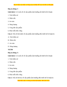 Giải thích: Có 6 y u t ế ố v s ề n ph ả ẩm nh h ả ư ng ở t i ớ thi t ế k kĩ ế thu t ậ : 1. Tính th m ẩ mĩ 2. Nhân tr c ắ 3. An toàn 4. Năng lư ng ợ 5. Vòng đ i ờ s n ph ả ẩm 6. Phát tri n b ể n v ề ng ữ Câu 8. Y u ế tố th năm ứ v s ề n ph ả m ẩ nh ả hư ng đ ở n t ế hi t ế k kĩ ế thu t ậ là: A. Vòng đ i ờ s n ph ả ẩm B. Phát tri n b ể n v ề ng ữ C. An toàn D. Năng lư ng ợ M i