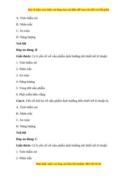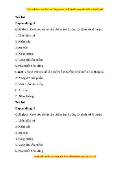 Đây là bản xem th , vu ử i lòng mua tài li u ệ đ xe ể m chi ti t (c ế ó l i ờ gi i ả ) 3. An toàn 4. Năng lư ng ợ 5. Vòng đ i ờ s n ph ả ẩm 6. Phát tri n b ể n v ề ng ữ Câu 7. Y u ế tố th t ứ v ư s ề n ph ả m ẩ nh ả hư ng đ ở n t ế hi t ế k kĩ ế thu t ậ là: A. Tính th m ẩ mĩ B. Nhân trắc C. An toàn D. Năng lư ng ợ Trả l i ờ Đáp án đúng: D