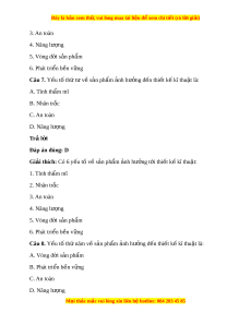 Giải thích: Có 6 y u t ế ố v s ề n ph ả ẩm nh h ả ư ng ở t i ớ thi t ế k kĩ ế thu t ậ : 1. Tính th m ẩ mĩ 2. Nhân tr c ắ 3. An toàn 4. Năng lư ng ợ 5. Vòng đ i ờ s n ph ả ẩm 6. Phát tri n b ể n v ề ng ữ Câu 6. Y u ế tố th ba v ứ ề s n ả ph m ẩ nh ả hư ng đ ở n t ế hi t ế k kĩ ế thu t ậ là: A. Tính th m ẩ mĩ B. Nhân trắc C. An toàn D. Năng lư ng ợ Trả l i ờ Đáp án đúng: C