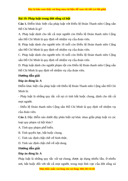 Đây là bản xem th , vu ử i lòng mua tài li u ệ đ xe ể m chi ti t ế (có l i ờ gi i ả ) Bài 19: Pháp lu t ậ trong đ i ờ s ng xã h ố i ộ Câu 1. Đi m ể khác bi t ệ c a ủ pháp lu t ậ v i ớ Đi u ề l ệ Đoàn Thanh niên C ng ộ s n ả Hồ Chí Minh là gì? A. Pháp lu t ậ dành cho t t ấ cả m i ọ ngư i ờ còn Đi u