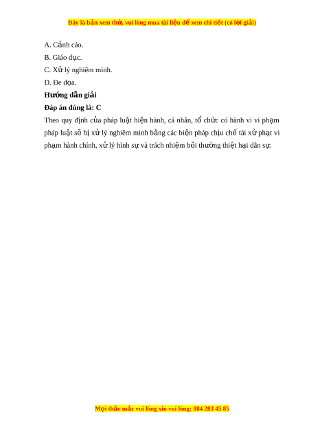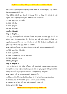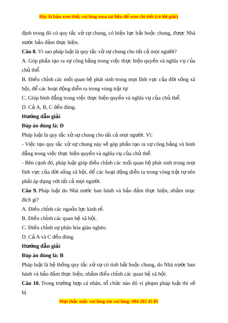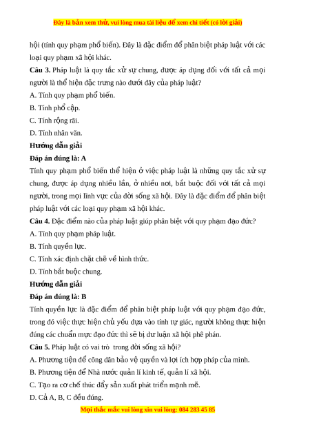 Đây là bản xem th , vu ử i lòng mua tài li u ệ đ xe ể m chi ti t (c ế ó l i ờ gi i ả ) h i ộ (tính quy ph m ạ ph bi ổ n) ế . Đây là đ c ặ đi m ể đ phân bi ể t ệ pháp lu t ậ v i ớ các lo i ạ quy ph m ạ xã h i ộ khác. Câu 3. Pháp lu t ậ là quy t c ắ xử sự chung, đư c ợ áp d ng ụ đ i ố v i ớ t t ấ cả m i ọ ngư i ờ là th hi ể n đ ệ c t ặ r ng nào d ư ư i ớ đây c a pháp l ủ u t ậ ? A. Tính quy ph m ạ phổ bi n. ế B. Tính ph c ổ p. ậ C. Tính r ng r ộ ãi. D. Tính nhân văn. Hư ng d ớ ẫn gi i ả Đáp án đúng là: A Tính quy ph m ạ phổ bi n ế thể hi n ệ ở vi c ệ pháp lu t ậ là nh ng ữ quy t c ắ xử sự chung, được áp d ng ụ nhi u ề l n, ầ ở nhi u ề n i ơ , b t ắ bu c ộ đ i ố v i ớ t t ấ cả m i ọ ngư i ờ , trong m i ọ lĩnh v c ự c a ủ đ i ờ s ng ố xã h i ộ . Đây là đ c ặ đi m ể đ ể phân bi t ệ pháp lu t ậ v i ớ các lo i ạ quy ph m ạ xã h i ộ khác. Câu 4. Đặc đi m ể nào c a ủ pháp lu t ậ giúp phân bi t ệ v i ớ quy ph m ạ đ o đ ạ c? ứ A. Tính quy ph m ạ pháp lu t ậ . B. Tính quy n l ề c. ự C. Tính xác đ nh ch ị t ặ ch v ẽ hì ề nh th c. ứ D. Tính b t ắ bu c chung. ộ Hư ng d ớ ẫn gi i ả Đáp án đúng là: B Tính quy n ề l c ự là đ c ặ đi m ể để phân bi t ệ pháp lu t ậ v i ớ quy ph m ạ đ o ạ đ c, ứ trong đó vi c ệ th c ự hi n ệ chủ y u ế d a ự vào tính t ự giác, ngư i ờ không th c ự hi n ệ đúng các chuẩn m c đ ự o đ ạ c ứ thì s b ẽ d ị l ư u n xã h ậ i ộ phê phán. Câu 5. Pháp lu t ậ có vai trò trong đ i ờ sống xã h i ộ ? A. Phư ng ơ ti n đ ệ công ể dân b o v ả quy ệ n và l ề i ợ ích h p pháp c ợ a ủ mình. B. Phư ng t ơ i n đ ệ N ể hà nư c ớ qu n l ả í kinh t , qu ế n l ả í xã h i ộ . C. T o r ạ a c ch ơ ế thúc đ y s ẩ n ả xu t ấ phát tri n m ể nh m ạ . ẽ D. C ả A, B, C đ u ề đúng. M i ọ thắc m c