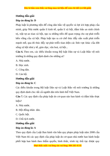 Câu 6. Theo em, các đi u ề kho n ả trong Bộ lu t ậ Dân sự và Lu t ậ B o ả vệ môi trư ng ờ là nh ng quy đ ữ nh dành cho nh ị ng ai ữ ? A. Nhà nư c. ớ B. H c ọ sinh. C. Công dân. D. Cán b . ộ Hư ng ớ d n gi ẫ i ả Đáp án đúng là: C Các đi u ề kho n ả trong Bộ lu t ậ Dân sự và Lu t ậ B o ả vệ môi trư ng ờ là nh ng ữ