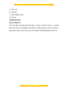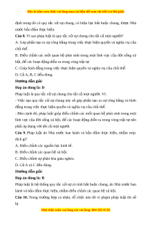 ố quan hệ phát sinh trong m i ọ lĩnh v c ự c a ủ đ i ờ s ng ố xã h i ộ , để các ho t ạ đ ng di ộ n r ễ a trong vòng tr t ậ tự C. Giúp bình đ ng t ẳ rong vi c ệ th c ự hi n quy ệ n và nghĩ ề a v c ụ a ủ ch t ủ h . ể D. C ả A, B, C đ u ề đúng. Hư ng d ớ ẫn gi i ả Đáp án đúng là: D Pháp lu t ậ là quy t c x ắ s ử chung cho t ự t ấ c m ả i ọ ngư i ờ . Vì: - Vi c ệ t o ạ quy t c ắ xử sự chung này s ẽ góp ph n ầ t o ạ ra s ự công b ng ằ và bình đ ng ẳ trong vi c t ệ h c hi ự n quy ệ n và ề nghĩa v c ụ a ch ủ t ủ h . ể - Bên c nh ạ đó, pháp lu t ậ giúp đi u ề ch nh ỉ các m i ố quan h ệ phát sinh trong m i ọ lĩnh v c ự c a ủ đ i ờ s ng ố xã h i ộ , đ ể các ho t ạ đ ng ộ di n ễ ra trong vòng tr t ậ t ự nên ph i ả áp d ng v ụ i ớ tất c m ả i ọ ngư i ờ . Câu 9. Pháp lu t ậ do Nhà nư c ớ ban hành và b o ả đ m ả th c ự hi n, ệ nh m ằ m c ụ đích gì? A. Đi u ề ch nh các ỉ ngu n l ồ c ki ự nh t . ế B. Đi u ch ề nh các quan h ỉ xã h ệ i ộ . C. Đi u ch ề nh s ỉ phân ự hóa giàu nghèo. D. C ả A và C đ u đúng. ề Hư ng d ớ ẫn gi i ả Đáp án đúng là: B Pháp lu t ậ là h ệ th ng ố quy t c ắ x ử s ự có tính b t ắ bu c ộ chung, do Nhà nư c ớ ban hành và b o đ ả m ả th c ự hi n, nh ệ m ằ đi u ch ề nh các quan ỉ h xã ệ h i ộ . Câu 10. Trong trư ng ờ h p ợ cá nhân, tổ ch c ứ nào đó vi ph m ạ pháp lu t ậ thì sẽ bị M i ọ thắc m c
