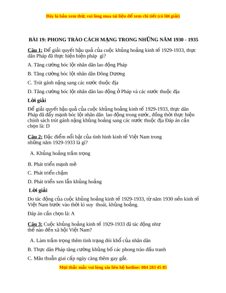 BÀI 19: PHONG TRÀO CÁCH M N Ạ G TRONG NH N Ữ G NĂM 1930 - 1935 Câu 1: Để gi i ả quy t ế h u qu ậ ả c a cu ủ ộc kh ng ho ủ ng ả kinh t 1929 ế -1933, th c ự dân Pháp đã th c hi ự n bi ệ n pháp ệ gì? A. Tăng cư ng ờ bóc l t ộ nhân dân lao đ ng ộ Pháp B. Tăng cư ng bóc ờ l t ộ nhân dân Đông Dư ng ơ C. Trút gánh n ng ặ sang các nư c ớ thu c đ ộ a ị D. Tăng cư ng ờ bóc l t ộ nhân dân lao đ ng ộ Pháp và các n ở ư c t ớ hu c đ ộ a ị L i ờ giải Để gi i ả quy t ế h u qu ậ ả c a cu ủ ộc kh ng ho ủ ng ả kinh t 1929 ế -1933, th c ự dân Pháp đã đẩy m nh ạ bóc l t ộ nhân dân lao đ ng ộ trong nư c, ớ đ ng t ồ h i ờ th c ự hi n ệ