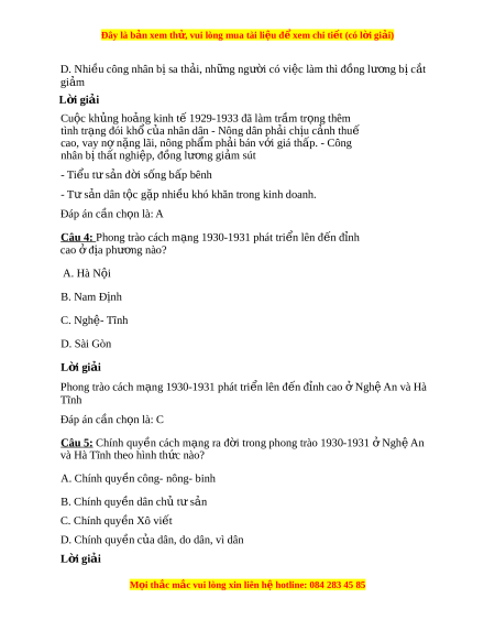 Câu 4: Phong trào cách m ng ạ 1930-1931 phát tri n l ể ên đ n đ ế nh ỉ cao đ ở ịa phư ng ơ nào? A. Hà N i ộ B. Nam Định C. Nghệ- Tĩnh D. Sài Gòn L i ờ giải Phong trào cách m ng ạ 1930-1931 phát tri n l ể ên đ n đ ế nh cao ỉ N ở gh ệ An và Hà Tĩnh Đáp án c n ch ầ n l ọ à: C