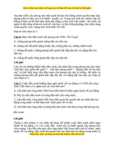 Câu 6: Mục tiêu đấu tranh c a phong t ủ rào 1930 -1931 là gì? A. chống phong ki n gi ế ành ru ng ộ đ t ấ cho dân cày B. chống ch đ ế ph ộ n ả đ ng t ộ hu c đ ộ a, ch ị ng phát ố xít, ch ng chi ố n t ế ranh C. chống đ qu ế ốc, ch ng phong ki ố n gi ế ành đ c l ộ p dân ậ t c và r ộ u ng đ ộ t ấ cho dân cày D. chống đ qu ế ốc Pháp giành đ c l ộ p ậ cho dân t c ộ L i ờ giải Căn cứ vào nh ng ữ kh u ẩ hi u ệ đ u ấ tranh c a