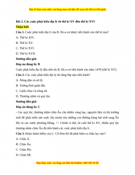 Câu 1. Cuộc phát kiến địa lí của B. Đi-a-xơ được tiến hành vào thế kỉ nào? A. Thế kỉ XIV. B. Thế kỉ XV. C. Thế kỉ XVI. D. Thế kỉ XVII. Hướng dẫn giải