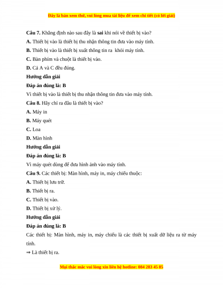 Câu 8. Hãy chỉ ra đâu là thiết bị vào? A. Máy in B. Máy quét C. Loa D. Màn hình Hướng dẫn giải