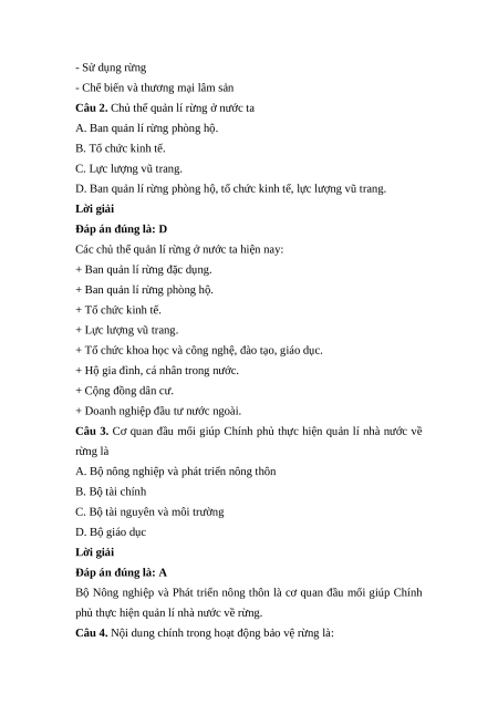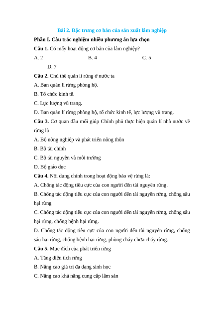 Câu 1. Có mấy hoạt động cơ bản của lâm nghiệp? A. 2 B. 4 C. 5 D. 7