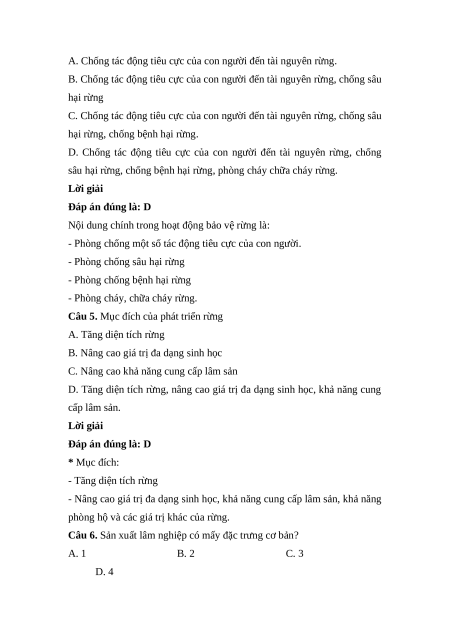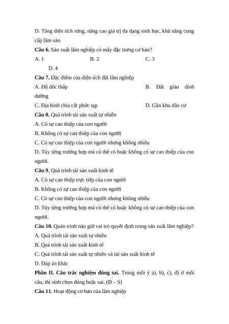 Câu 6. Sản xuất lâm nghiệp có mấy đặc trưng cơ bản? A. 1 B. 2 C. 3 D. 4