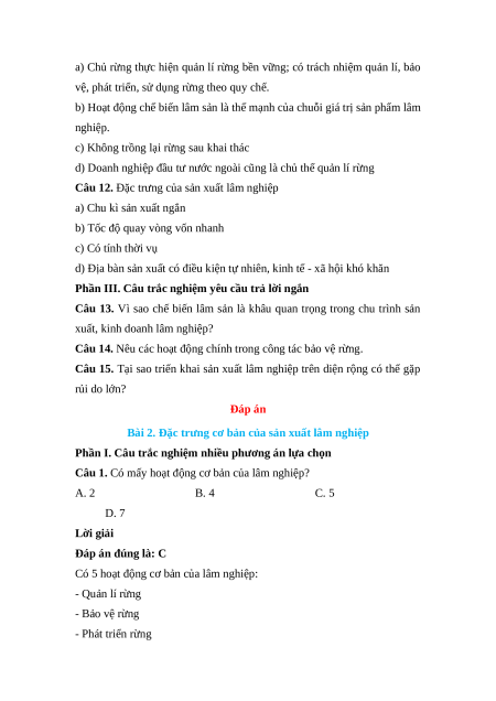 Câu 12. Đặc trưng của sản xuất lâm nghiệp a) Chu kì sản xuất ngắn