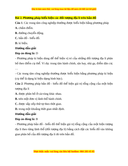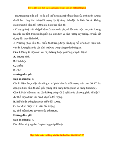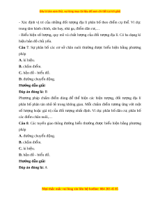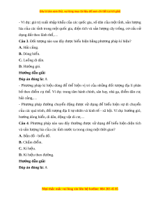 ụ trung tâm hành chính, sân bay, nhà ga, đi m ể dân c , ư … - Các trung tâm công nghi p ệ thư ng ờ đư c ợ bi u ể hi n ệ b ng ằ phư ng ơ pháp kí hi u ệ (c t ụ h l ể à d ng ạ kí hi u d ệ ng hì ạ nh h c) ọ . Câu 2. Phư ng ơ pháp b n ả đồ - bi u ể đồ thể hi n ệ giá trị t ng ổ c ng ộ c a ủ m t ộ hi n ệ tư ng ợ đ a ị lí A. đư c ợ phân bố cácvùng khác ở nhau. B. trên m t ộ đ n v ơ l ị ãnh th hành chí ổ nh. C. đư c ợ s p ắ x p t ế h t ứ t ự heo th i ờ gian. D. trong m t ộ kho ng t ả h i ờ gian nh t ấ đ nh. ị Hư ng d ớ ẫn gi i ả Đáp án đúng là: B - Phư ng ơ pháp b n ả đồ - bi u ể đ ồ th ể hi n ệ giá tr ịt ng ổ c ng ộ c a ủ m t ộ hi n ệ tư ng ợ địa lí theo t ng ừ lãnh thổ (đ i ố tư ng ợ đ a ị lí) b ng ằ cách đ t ặ các bi u ể đ ồ vào không gian phân bố c a ủ đ i ố tư ng ợ đ a ị lí đó trên b n ả đ . ồ M i
