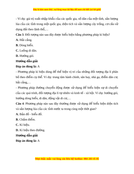 Câu 3. Đối tư ng nào s ợ au đây đư c ợ bi u hi ể n b ệ ng ph ằ ư ng ơ pháp kí hi u? ệ A. H i ả c ng. ả B. Dòng bi n. ể C. Luồng di dân. D. Hư ng ớ gió. Hư ng d ớ ẫn gi i ả Đáp án đúng là: A - Phư ng ơ pháp kí hi u ệ dùng để thể hi n ệ vị trí c a ủ nh ng ữ đ i ố tư ng ợ đ a ị lí phân bố theo đi m ể c ụ th . ể Ví d :
