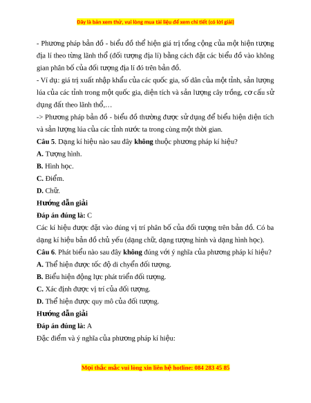 - Phư ng ơ pháp b n ả đồ - bi u ể đ ồ th ể hi n ệ giá tr ịt ng ổ c ng ộ c a ủ m t ộ hi n ệ tư ng ợ địa lí theo t ng ừ lãnh thổ (đ i ố tư ng ợ đ a ị lí) b ng ằ cách đ t ặ các bi u ể đ ồ vào không gian phân bố c a ủ đ i ố tư ng ợ đ a ị lí đó trên b n ả đ . ồ - Ví d : ụ giá tr xu ị t ấ nh p ậ kh u c ẩ a các ủ qu c ố gia, s dân c ố a m ủ t ộ t nh, s ỉ n l ả ư ng ợ lúa c a ủ các t nh ỉ trong m t ộ qu c ố gia, di n ệ tích và s n ả lư ng ợ cây tr ng, ồ c ơ c u ấ sử d ng đ ụ ất theo lãnh th ,… ổ -> Phư ng ơ pháp b n ả đồ - bi u ể đ ồ thư ng ờ đư c ợ s ử d ng ụ đ ể bi u ể hi n ệ di n ệ tích và s n l ả ư ng ợ lúa c a các ủ tỉnh nư c t ớ a trong cùng m t ộ th i ờ gian. Câu 5. D ng ạ kí hi u nào s ệ au đây không thu c ộ phư ng pháp kí ơ hi u? ệ A. Tư ng hì ợ nh. B. Hình h c. ọ C. Đi m ể . D. Ch . ữ Hư ng d ớ ẫn gi i ả Đáp án đúng là: C Các kí hi u ệ đư c ợ đ t