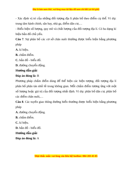 Câu 7. Sự phân bố các cơ sở chăn nuôi thư ng ờ đư c ợ bi u ể hi n ệ b ng ằ phư ng ơ pháp A. kí hi u. ệ B. chấm đi m ể . C. b n ả đồ - bi u đ ể . ồ D. đư ng ờ chuy n đ ể ng. ộ Hư ng d ớ ẫn gi i ả Đáp án đúng là: B Phư ng ơ pháp ch m ấ đi m ể dùng để thể hi n ệ các hi n ệ tư ng, ợ đ i ố tư ng ợ đ a ị lí