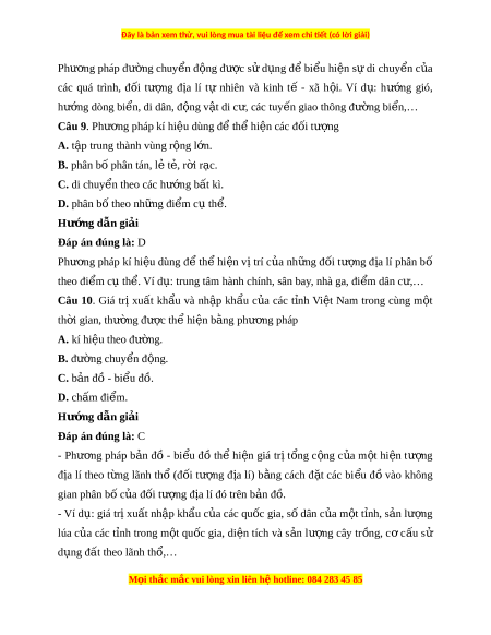 phân bố phân tán nhỏ lẻ trong không gian. M i ỗ ch m ấ đi m ể tư ng ơ ng ứ v i ớ m t ộ số lư ng ợ ho c ặ giá trị c a ủ đ i ố tư ng ợ nh t ấ đ nh. ị Ví d : ụ phân b ố dân c , ư phân bố các đi m ể chăn nuôi,… Câu 8. Các tuy n ế giao thông đư ng ờ bi n ể thư ng ờ đư c ợ bi u ể hi n ệ b ng ằ phư ng ơ pháp A. đư ng ờ chuy n đ ể ng. ộ B. chấm đi m ể . C. kí hi u. ệ D. b n ả đồ - bi u đ ể . ồ Hư ng d ớ ẫn gi i ả Đáp án đúng là: A M i