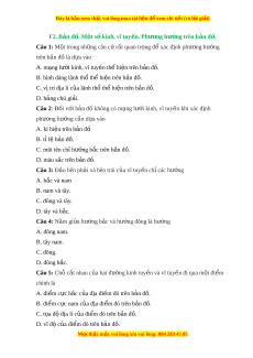 Câu 3: Đầu bên ph i ả và bên trái c a vĩ ủ tuy n ch ế các ỉ hư ng ớ A. b c và ắ nam B. nam và tây. C. đông và tây. D. tây và b c. ắ Câu 4: N m ằ gi a h ữ ư ng b ớ ắc và hư ng ớ đông là hư ng ớ A. đông nam. B. tây nam. C. đông. D. đông b c. ắ Câu 5: Chỗ c t ắ nhau c a ủ hai đư ng ki ờ nh tuy n và vĩ ế tuy n đi ế qua m t ộ đi m ể chính là A. đi m ể c c b ự c ắ c a đ ủ a đi ị m ề đó trên b n ả đ . ồ B. đi m ể c c ự nam c a đ ủ a đi ị m ể đó trên b n đ ả . ồ C. t a ọ đ đ ộ ịa lí c a đi ủ m ể đó trên b n đ ả . ồ D. vĩ đ c ộ a đi ủ m ể đó trên b n ả đ . ồ M i