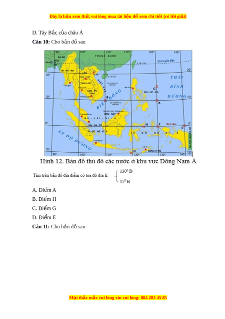 Đây là bản xem th , vu ử i lòng mua tài li u ệ đ xe ể m chi ti t ế (có l i ờ gi i ả ) D. Tây B c ắ c a châu Á ủ Câu 10: Cho b n đ ả ồ sau A. Đi m ể A B. Đi m ể H C. Đi m ể G D. Đi m ể E Câu 11: Cho b n ả đồ sau: M i