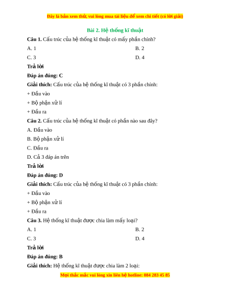 Đây là bản xem th , vu ử i lòng mua tài li u ệ đ xe ể m chi ti t (c ế ó l i ờ gi i ả ) Bài 2. H t ệ h ng kĩ ố thu t ậ Câu 1. Cấu trúc c a ủ h t ệ hống kĩ thu t ậ có m y ph ấ n chí ầ nh? A. 1 B. 2 C. 3 D. 4 Trả l i ờ Đáp án đúng: C