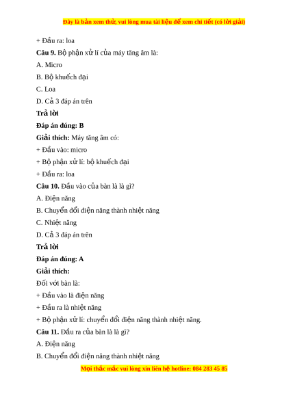 Đây là bản xem th , vu ử i lòng mua tài li u ệ đ xe ể m chi ti t (c ế ó l i ờ gi i ả ) + Đầu ra: loa Câu 9. Bộ ph n x ậ ử lí c a ủ máy tăng âm là: A. Micro B. B khu ộ ch ế đ i ạ C. Loa D. C 3 đáp án ả trên Trả l i ờ Đáp án đúng: B