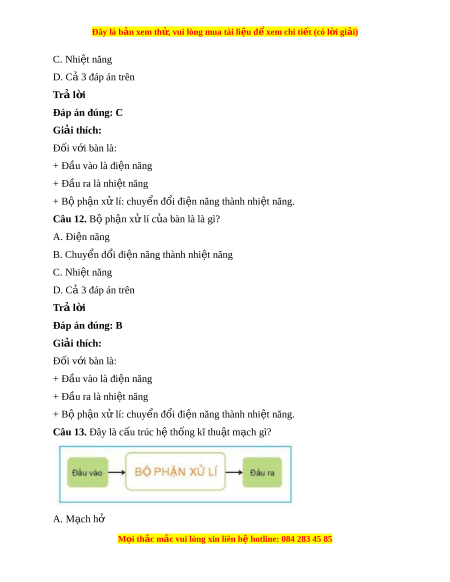 Câu 11. Đầu ra c a bàn ủ là là gì? A. Đi n năng ệ B. Chuy n đ ể ổi đi n năng t ệ hành nhi t ệ năng M i