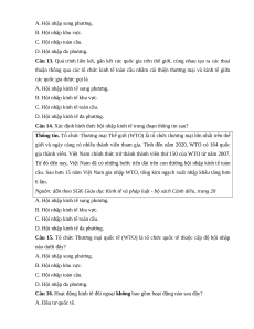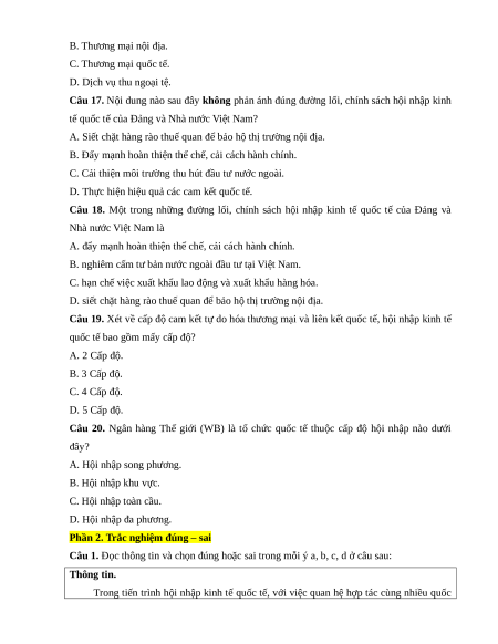 Câu 15. Tổ chức Thương mại quốc tế (WTO) là tổ chức quốc tế thuộc cấp độ hội nhập nào dưới đây? A. Hội nhập song phương. B. Hội nhập khu vực. C. Hội nhập toàn cầu. D. Hội nhập đa phương.