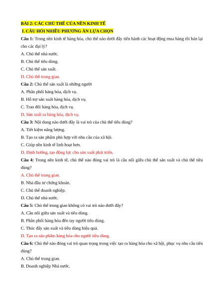 Câu 4: Trong nền kinh tế, chủ thể nào đóng vai trò là cầu nối giữa chủ thể sản xuất và chủ thể tiêu dùng? A. Chủ thể trung gian.