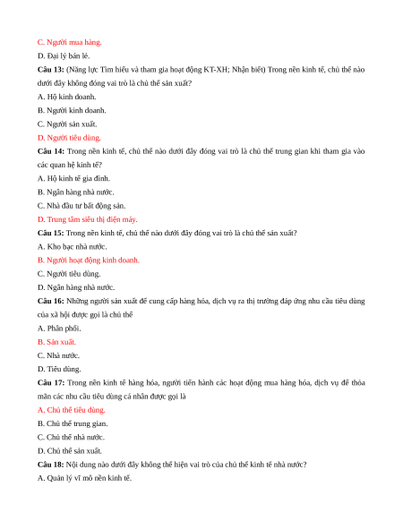 Câu 14: Trong nền kinh tế, chủ thể nào dưới đây đóng vai trò là chủ thể trung gian khi tham gia vào các quan hệ kinh tế? A. Hộ kinh tế gia đình. B. Ngân hàng nhà nước.