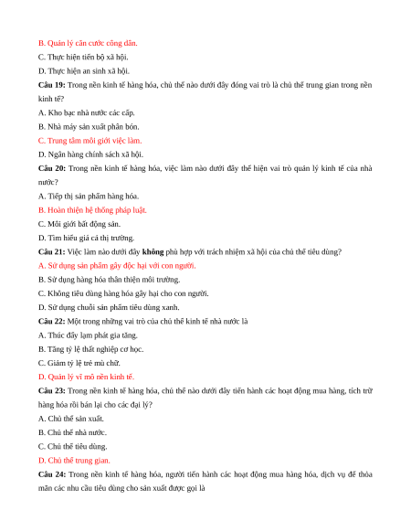 Câu 10: Trong nền kinh tế nước ta, chủ thể nào đóng vai trò quản lý toàn bộ nền kinh tế quốc dân? A. Chủ thể trung gian. B. Chủ thể nhà nước. C. Chủ thể tiêu dùng. D. Chủ thể sản xuất.