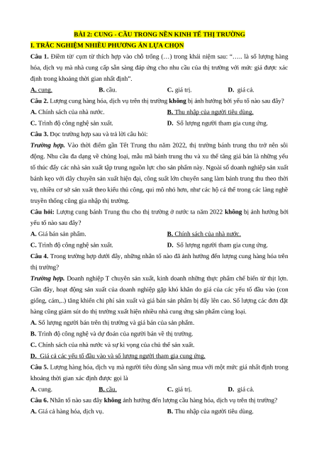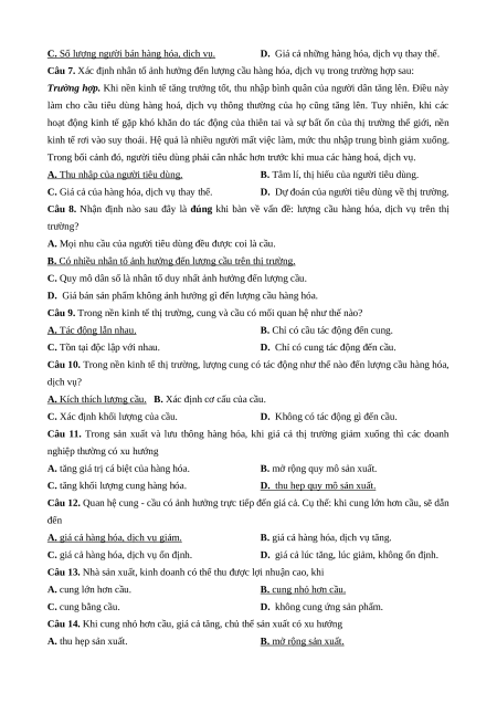 Câu 10. Trong nền kinh tế thị trường, lượng cung có tác động như thế nào đến lượng cầu hàng hóa, dịch vụ? A. Kích thích lượng cầu.