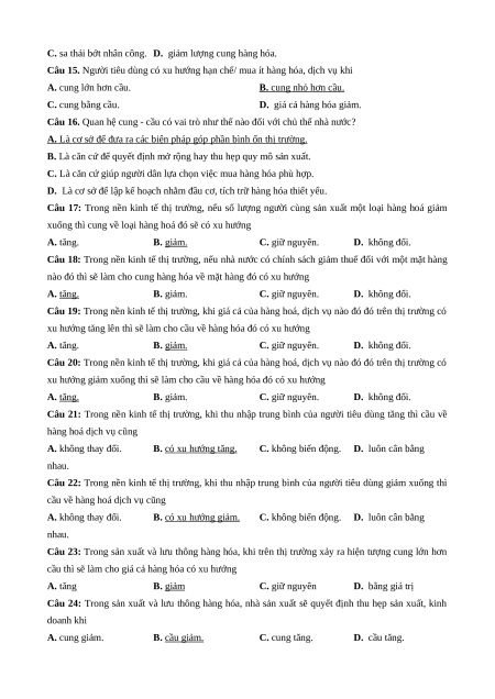 Câu 21: Trong nền kinh tế thị trường, khi thu nhập trung bình của người tiêu dùng tăng thì cầu về hàng hoá dịch vụ cũng A. không thay đổi.