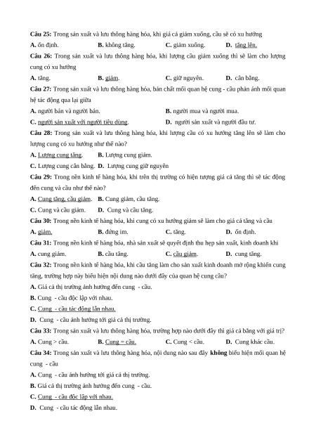 Câu 25: Trong sản xuất và lưu thông hàng hóa, khi giá cả giảm xuống, cầu sẽ có xu hướng A. ổn định. B. không tăng. C. giảm xuống. D. tăng lên.