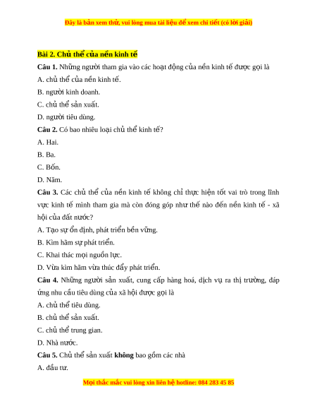 Đây là bản xem th , vu ử i lòng mua tài li u ệ đ xe ể m chi ti t (c ế ó l i ờ gi i ả ) Bài 2. Ch t ủ h c ể a n ủ n ki ề nh tế Câu 1. Nh ng ữ ngư i ờ tham gia vào các ho t ạ đ ng c ộ a ủ n n ki ề nh t đ ế ư c ợ g i ọ là A. chủ th c ể a n ủ n ki ề nh t . ế B. ngư i ờ kinh doanh. C. ch t ủ h s ể n xu ả t ấ . D. ngư i ờ tiêu dùng.