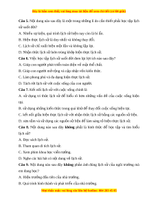 ộ dung nào sau đây không ph n ả ánh đúng vai trò c a ủ tri th c ứ l ch ị sử đối v i ớ cu c ộ s ng c ố a con ng ủ ư i ờ ? A. Giúp con ngư i ờ sáng t o l ạ ch s ị cho ử phù h p v ợ i ớ xã h i ộ hi n t ệ i ạ . B. Cung c p nh ấ ng t ữ hông tin h u í ữ ch v quá ề kh xã h ứ i ộ loài ngư i ờ . C. Giúp con ngư i ờ bi t ế đư c ợ ngu n g ồ c c ố a ủ b n t ả hân, gia đình. D. Góp phần t o ạ nên ý th c dân t ứ c ộ và b n s ả c văn ắ hóa c ng đ ộ ng. ồ Câu 12. Tri th c ứ lịch s có đi ử m ể gì tư ng ơ đ ng v ồ i ớ nh n ậ th c l ứ ch s ị ? ử A. Là duy nh t ấ và không thay đ i ổ theo th i ờ gian. B. Là toàn bộ nh ng gì ữ đã di n r ễ a trong quá kh . ứ C. Là nh ng ữ hi u ể bi t ế c a con ng ủ ư i ờ v quá kh ề . ứ D. Không d a ự vào ý muốn ch quan c ủ a ủ con ngư i ờ . Câu 13. Tri th c ứ lịch s m ử ang đ c ặ đi m ể nào sau đây? A. R ng l ộ n và đang ớ d ng. ạ B. Không bao gi bi ờ n đ ế ổi. C. Ch m ỉ ang tính ch quan. ủ