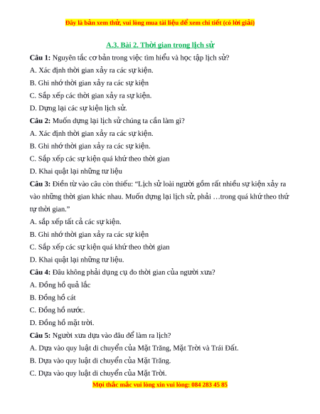 Đây là bản xem th , vu ử i lòng mua tài li u ệ đ xe ể m chi ti t (c ế ó l i ờ gi i ả ) A .3. B ài 2. Th i ờ gian trong l ch s ị ử Câu 1: Nguyên t c ắ c b ơ n ả trong vi c t ệ ìm hi u và h ể c t ọ p ậ l ch ị s ? ử A. Xác đ nh t ị h i ờ gian x y r ả a các s ki ự n. ệ B. Ghi nh t ớ h i ờ gian x y ả ra các sự ki n ệ C. S p x ắ p các ế th i ờ gian x y r ả a sự ki n. ệ D. D ng ự l i ạ các s ki ự n l ệ ch ị s . ử Câu 2: Muốn d ng l ự i