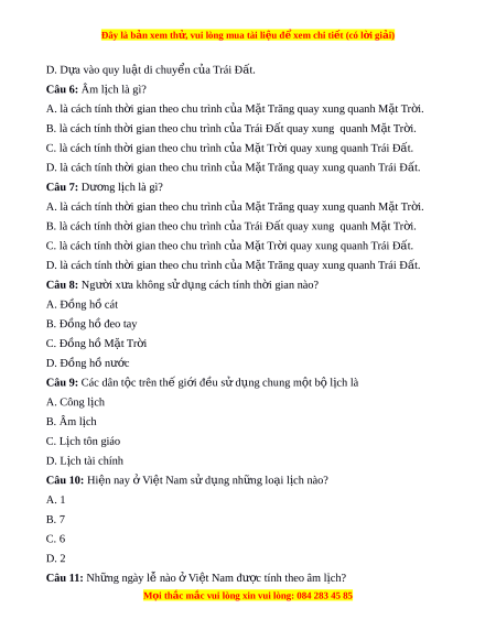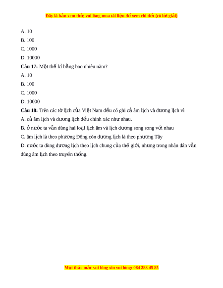 Đây là bản xem th , vu ử i lòng mua tài li u ệ đ xe ể m chi ti t (c ế ó l i ờ gi i ả ) A. 10 B. 100 C. 1000 D. 10000 Câu 17: M t ộ thế kỉ b ng ằ bao nhiêu năm? A. 10 B. 100 C. 1000 D. 10000 Câu 18: Trên các t l ờ ịch c a ủ Vi t ệ Nam đ u có ghi ề c âm ả l ch và d ị ư ng ơ l ch vì ị