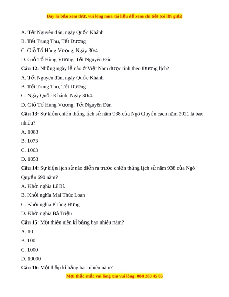 C. Ngày Quốc Khánh, Ngày 30/4. D. Giỗ Tổ Hùng Vư ng, ơ T t ế Nguyên Đán Câu 13: S ki ự ện chi n t ế h ng l ắ ịch sử năm 938 c a N ủ gô Quy n ề cách năm 2021 là bao nhiêu? A. 1083 B. 1073 C. 1063 D. 1053 Câu 14: S ki ự ện lịch s nào di ử n r ễ a trư c chi ớ n t ế h ng ắ lịch s năm ử 938 c a ủ Ngô Quy n ề 690 năm? A. Kh i ở nghĩa Lí Bí. B. Kh i ở nghĩa Mai Thúc Loan C. Kh i ở nghĩa Phùng H ng ư D. Kh i ở nghĩa Bà Tri u ệ Câu 15: M t ộ thiên niên k b ỉ ng ằ bao nhiêu năm? A. 10 B. 100 C. 1000 D. 10000 Câu 16: M t ộ th p ậ k b ỉ ng bao nhi ằ êu năm? M i ọ thắc m c