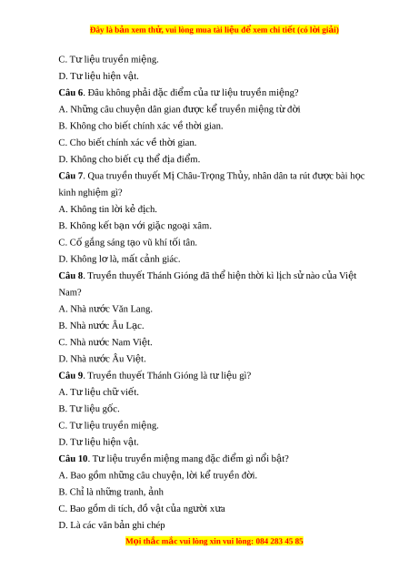 ủ , nhân dân ta rút đư c bài ợ h c ọ kinh nghi m ệ gì? A. Không tin l i ờ k đ ẻ ch. ị B. Không k t ế b n ạ v i ớ gi c ặ ngo i ạ xâm. C. Cố g ng ắ sáng t o vũ khí ạ tối tân. D. Không l l ơ à, mất c nh gi ả ác. Câu 8. Truy n ề thuy t ế Thánh Gióng đã th hi ể n t ệ h i ờ kì l ch ị s nào c ử a ủ Vi t ệ Nam? A. Nhà nư c ớ Văn Lang. B. Nhà nư c  ớ u L c. ạ C. Nhà nư c N ớ am Vi t ệ . D. Nhà nư c ớ Âu Vi t ệ . Câu 9. Truy n ề thuy t ế Thánh Gióng là t l ư i u gì ệ ? A. T l ư iệu ch vi ữ t ế . B. T l ư iệu gốc. C. T l ư iệu truy n m ề i ng. ệ D. T l ư iệu hiện v t ậ . Câu 10. T l ư iệu truy n m ề i ng m ệ ang đ c ặ đi m ể gì n i ổ b t ậ ? A. Bao gồm nh ng câu chuy ữ ện, l i ờ k t ể ruy n đ ề i ờ . B. Chỉ là nh ng t ữ ranh, nh ả C. Bao g m ồ di tích, đ v ồ t ậ c a ủ ngư i ờ x a ư D. Là các văn b n ả ghi chép M i