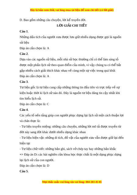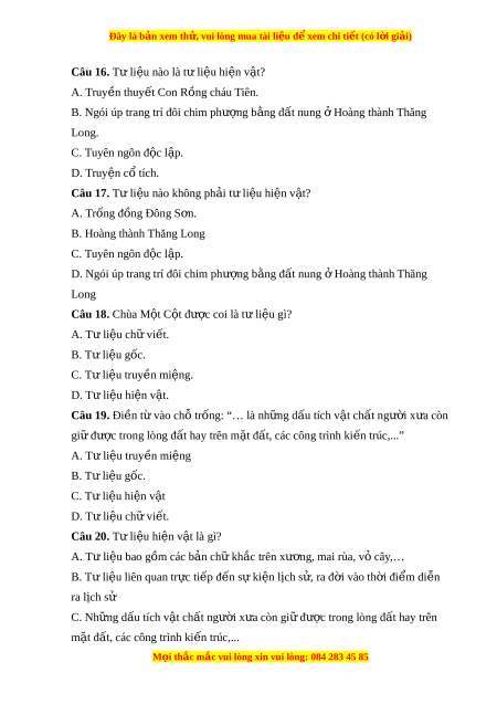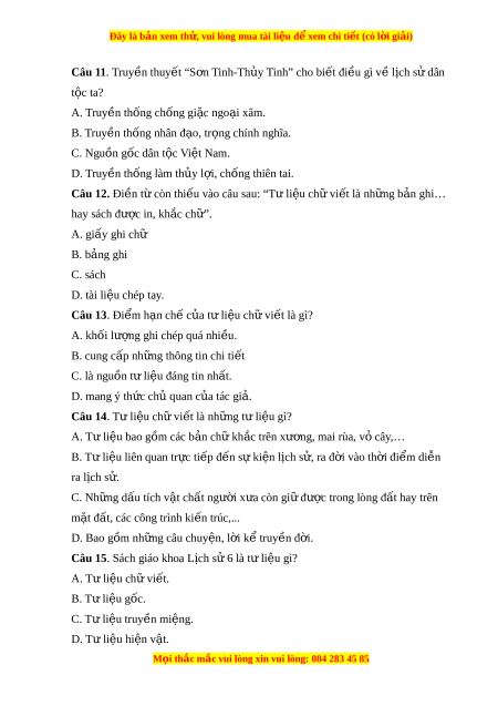 Đây là bản xem th , vu ử i lòng mua tài li u ệ đ xe ể m chi ti t ế (có l i ờ gi i ả ) Câu 11. Truy n t ề huy t ế “S n ơ Tinh-Th y ủ Tinh” cho bi t ế đi u gì ề v l ề ch s ị dân ử t c t ộ a? A. Truy n ề thống chống gi c ặ ngo i ạ xâm. B. Truy n t ề hống nhân đ o, t ạ r ng chí ọ nh nghĩa. C. Nguồn gốc dân t c ộ Việt Nam. D. Truy n ề thống làm th y l ủ i ợ , chống thiên tai. Câu 12. Đi n t ề còn t ừ hi u vào câu ế sau: “T l ư i u ch ệ vi ữ t ế là nh ng b ữ n ả ghi… hay sách đư c i ợ n, kh c ắ ch ”. ữ A. giấy ghi chữ B. b ng ả ghi C. sách D. tài li u chép ệ tay. Câu 13. Đi m ể h n ch ạ ế c a t ủ l ư i u ch ệ vi ữ t ế là gì? A. khối lư ng ợ ghi chép quá nhi u. ề B. cung cấp nh ng ữ thông tin chi ti t ế C. là nguồn t l ư i u đáng t ệ in nh t ấ . D. mang ý th c ch ứ quan ủ c a t ủ ác gi . ả Câu 14. T l ư iệu ch vi ữ t ế là nh ng t ữ l ư i u gì ệ ? A. T l ư iệu bao gồm các b n ch ả ữ kh c t ắ rên xư ng, m ơ ai rùa, v cây ỏ ,… B. T l ư iệu liên quan tr c t ự i p đ ế n s ế ự ki n l ệ ch ị s , r ử a đ i ờ vào th i ờ đi m ể di n ễ ra lịch s . ử C. Nh ng ữ d u t ấ ích v t ậ ch t ấ ngư i ờ x a còn gi ư đ ữ ư c t ợ rong lòng đ t ấ hay trên m t