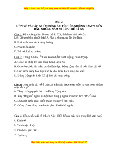 A. Goóc-ba-chốp lên làm t ng t ổ h ng L ố iên Xô B. Goóc-ba-ch p l ố ên n m ắ quy n l ề ãnh đ o Đ ạ ng ả c ng s ộ n và ả ti n ế hành c i ả t ổ C. Các nước c ng hòa ộ tuyên b l ố y khai kh i ỏ Liên bang Xô Vi t ế D. Đ ng C ả ng s ộ n L ả iên Xô b đ ị ình ch ho ỉ t ạ đ ng ộ Câu 3: Công cu c c ộ i ả tổ ở Liên Xô b t ắ đ u đ ầ ư c t ợ h c hi ự n t ệ năm ừ 1985 nh m ằ m c đí ụ ch gì? A. Tăng cư ng ờ quy n l ề c cho Đ ự ng ả C ng s ộ n. ả B. Xây d ng ch ự nghĩ ủ a xã h i