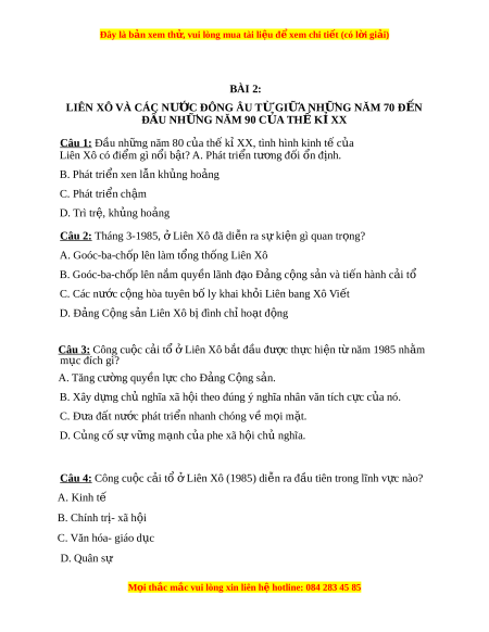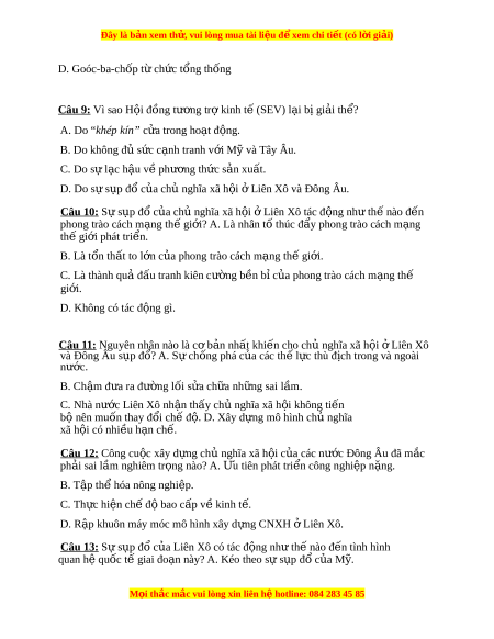 Đây là bản xem th , vu ử i lòng mua tài li u ệ đ xe ể m chi ti t (c ế ó l i ờ gi i ả ) B. Kéo theo sự s p đ ụ ổ c a ủ CNXH trên ph m ạ vi toàn th gi ế i ớ . C. Kéo theo sự s p đ ụ ổ c a ủ tr t ậ tự hai c c I ự anta. D. Không có nh ả hư ng gì ở . Câu 14: S s ự p ụ đổ c a ch ủ nghĩ ủ a xã h i ộ L ở iên Xô có ph i ả là s s ự p ụ đ c ổ a ủ chủ nghĩa xã h i ộ trên ph m ạ vi toàn th gi ế i ớ hay không? Vì sao?