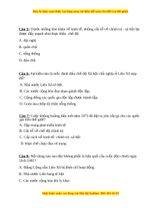 ự ện nào là mốc đánh d u ch ấ ế đ X ộ ã h i ộ chủ nghĩa L ở iên Xô s p ụ đổ? A. Nhà nư c ớ Liên Xô tê li t ệ . B. Các nước c ng hòa ộ đua nhau giành đ c l ộ p. ậ C. C ng đ ộ ồng các qu c gi ố a đ c ộ l p đ ậ ư c ợ thành l p. ậ D. Goóc-ba-chốp t ch ừ c ứ t ng t ổ h ng ố Câu 7: Cuộc kh ng ho ủ ng ả d u m ầ năm ỏ 1973 đã đ t ặ ra yêu c u gì ầ cho các qu c ố gia trên thế gi i ớ ? A. T p t ậ rung phát tri n ể kinh tế B. C i ả tổ v ch ề đ ế chí ộ nh tr ị C. C i ả cách v ki ề nh t - ế chính tr - ị xã h i ộ D. H n ạ ch ch ế y ạ đua vũ trang Câu 8: N i