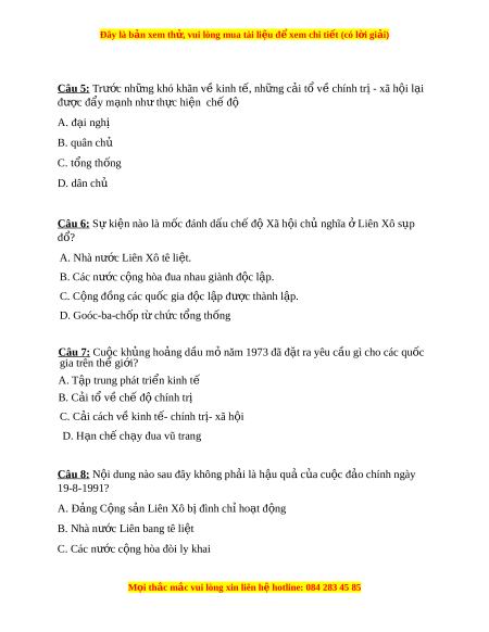 Đây là bản xem th , vu ử i lòng mua tài li u ệ đ xe ể m chi ti t (c ế ó l i ờ gi i ả ) Câu 5: Trư c ớ nh ng khó khăn v ữ ki ề nh t , nh ế ng c ữ i ả tổ về chính tr - ị xã h i ộ l i ạ đư c ợ đ y m ẩ nh nh ạ t ư h c hi ự n ch ệ ế đ ộ A. đ i ạ ngh ị B. quân ch ủ C. tổng thống D. dân ch ủ Câu 6: S ki