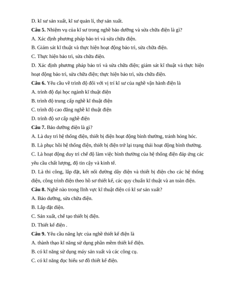 Câu 4. Vị trí việc làm của nghề sản xuất, chế tạo thiết bị điện là A. kĩ sư sản xuất. B. kĩ sư quản lí. C. thợ sản xuất.