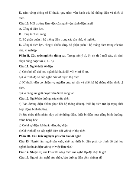 Câu 10. Môi trường làm việc của nghề vận hành điện là gì? A. Công ti điện lực. B. Công ti chiếu sáng.