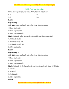 Câu 1. Theo nguồn gốc, cây trồng được phân làm mấy lo i ạ ? A. 1 B. 2 C. 3 D. 4 Trả l i ờ Đáp án đúng: C