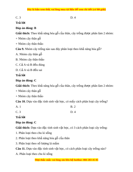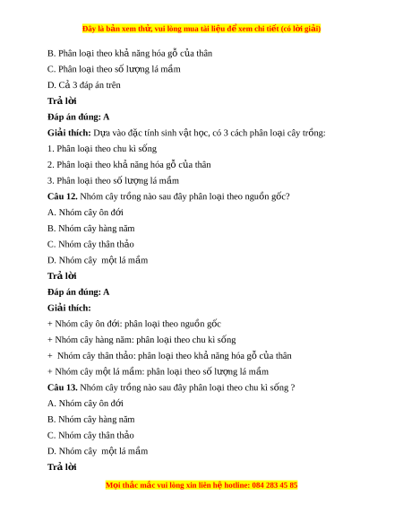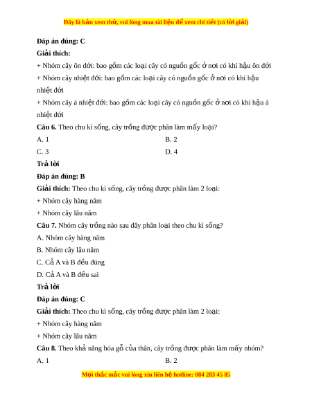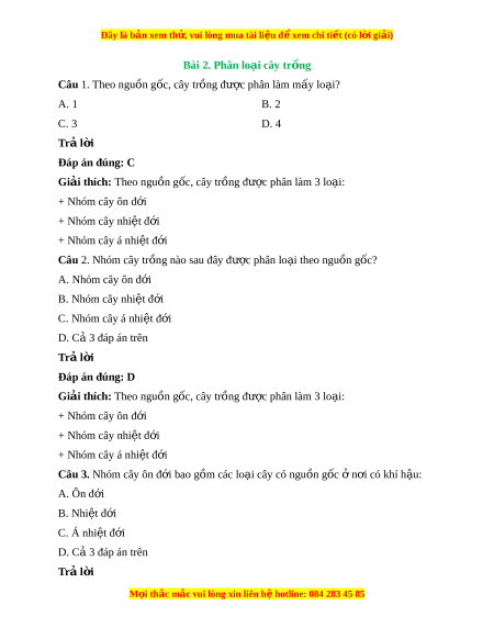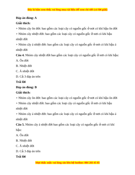 Đây là bản xem th , vu ử i lòng mua tài li u ệ đ xe ể m chi ti t (c ế ó l i ờ gi i ả ) Đáp án đúng: C Giải thích: + Nhóm cây ôn đ i ớ : bao g m ồ các lo i ạ cây có ngu n g ồ c ố n ở i ơ có khí h u ôn đ ậ i ớ + Nhóm cây nhi t ệ đ i ớ : bao g m ồ các lo i ạ cây có ngu n g ồ c ố n ở i ơ có khí h u ậ nhiệt đ i ớ + Nhóm cây á nhi t ệ đ i ớ : bao g m ồ các lo i ạ cây có ngu n g ồ c ố n ở i ơ có khí h u á ậ nhiệt đ i ớ